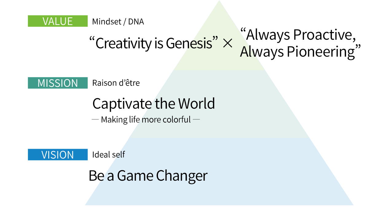 SEGA SAMMY has established a Mission Pyramid, shared across the Group, to guide the business activities of SEGA and SAMMY and other group companies. The Mission Pyramid consists of Value (Mindset/DNA), Mission (Raison d’être), and Vision (Ideal self). The Group is striving to ensure that all its employees clearly understand the Mission Pyramid and work together to enhance corporate value.