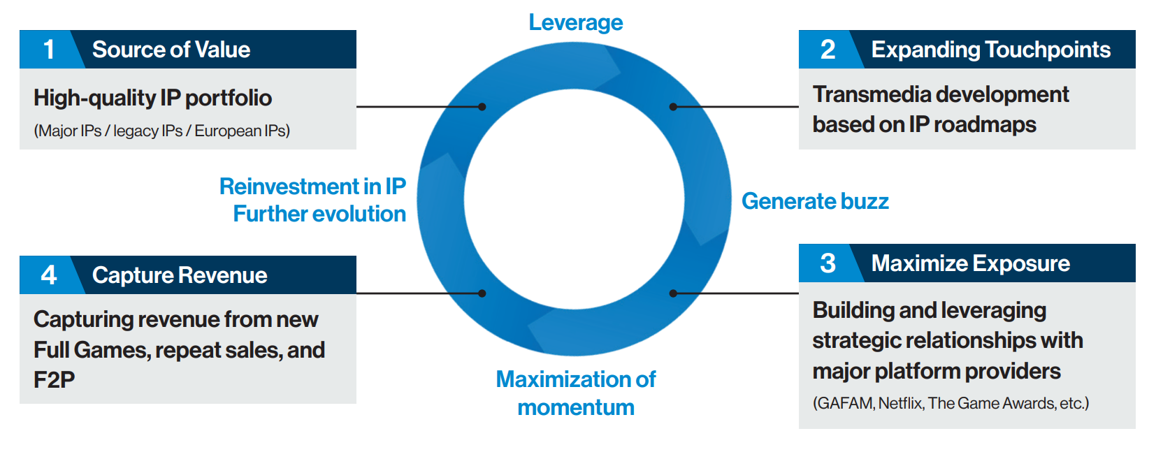 The strategy follows a roadmap for each flagship IP designed to multiply user touchpoints across a wide range of channels. We are also promoting initiatives such as building strategic relationships with major platform providers*² and participating in global events such as The Game Awards. These efforts help maximize IP exposure on a global scale, leading to revenue opportunities such as new game releases, repeat sales of existing titles, Free-to-Play (F2P), and licensing, then reinvesting the profits gained back into further growth of the IPs. Through this continuous cycle, we aim to enhance the IP value.