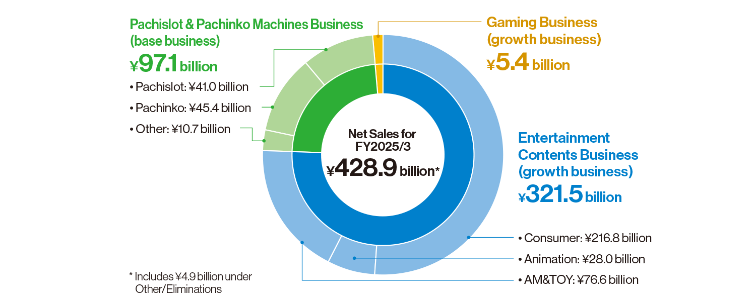The Group’s business portfolio, which spans an extremely broad range of entertainment areas, is the foundation for the Group’s sustained growth in corporate value. The ability of the Pachislot & Pachinko Machines Business to generate stable cash is an advantage that other specialized game manufacturers do not have, and enables active investment in further growth of the Entertainment Contents Business as well as in new areas such as Gaming Business. A diversified business portfolio with widely differing areas reduces the risk of earnings fluctuations due to changes in the environment. Diverse user touchpoints such as games, goods, animation, pachislot & pachinko machines, and manga will expand the potential for maximizing IP value through multifaceted development.