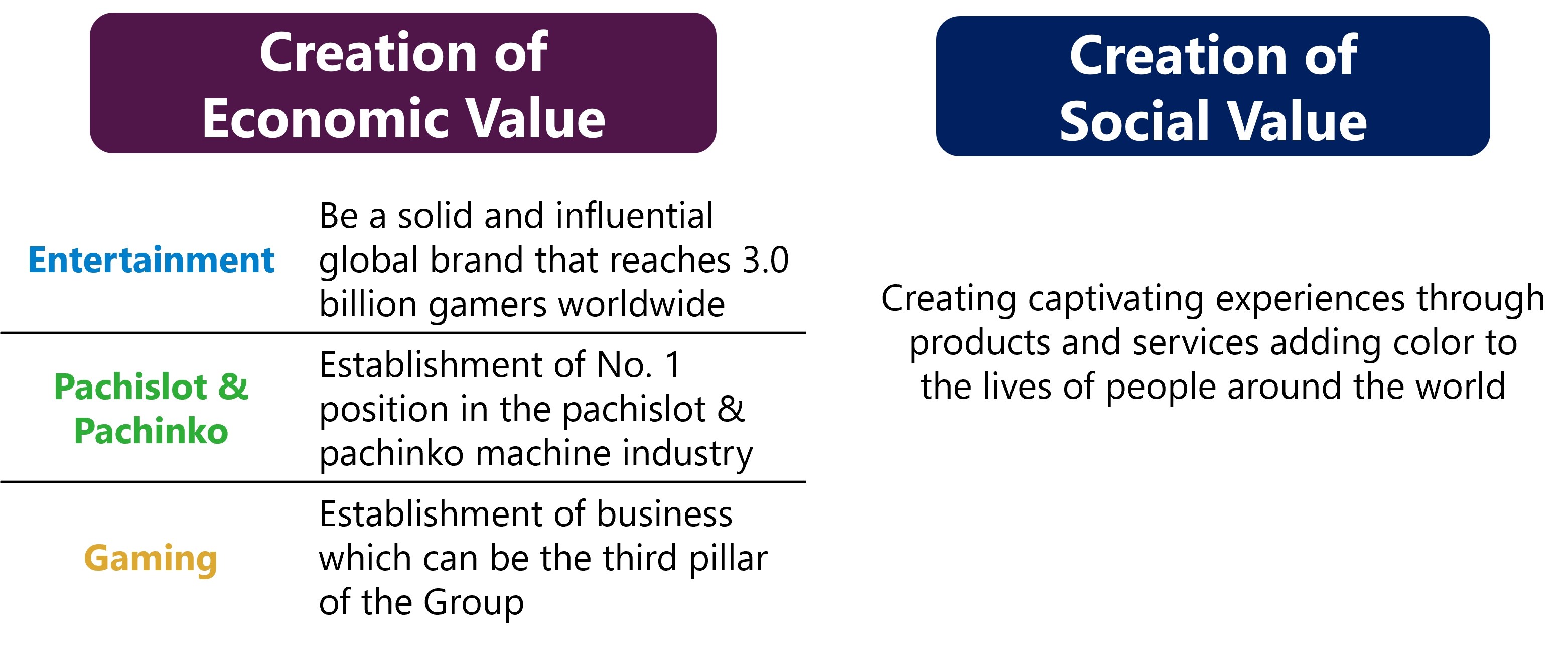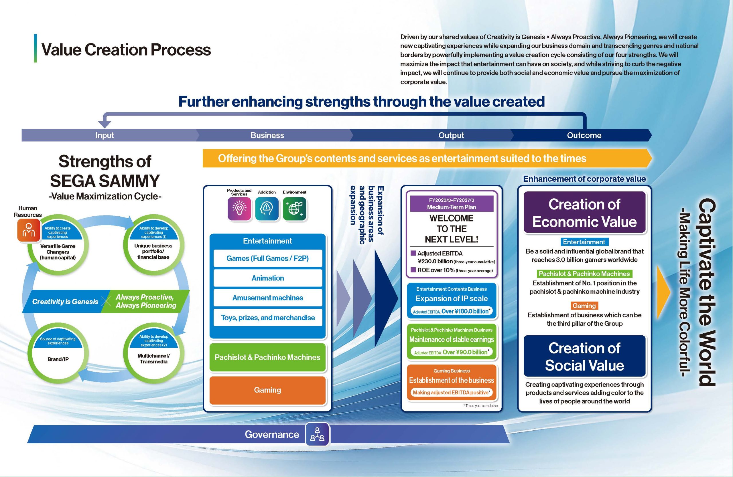 By further strengthening SEGA SAMMY’s strengths through the value created in this way, the Group continues to drive the cycle of its value creation process. Through this value creation process, SEGA SAMMY Group aims to realize its Mission/Purpose: Captivate the World -Making Life More Colorful.