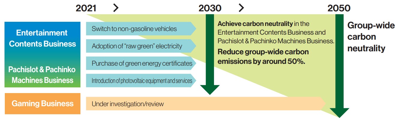 ・Achieve carbon neutrality by 2030 in the Entertainment Content and Pachinko & Pachinko Machines businesses, our core businesses