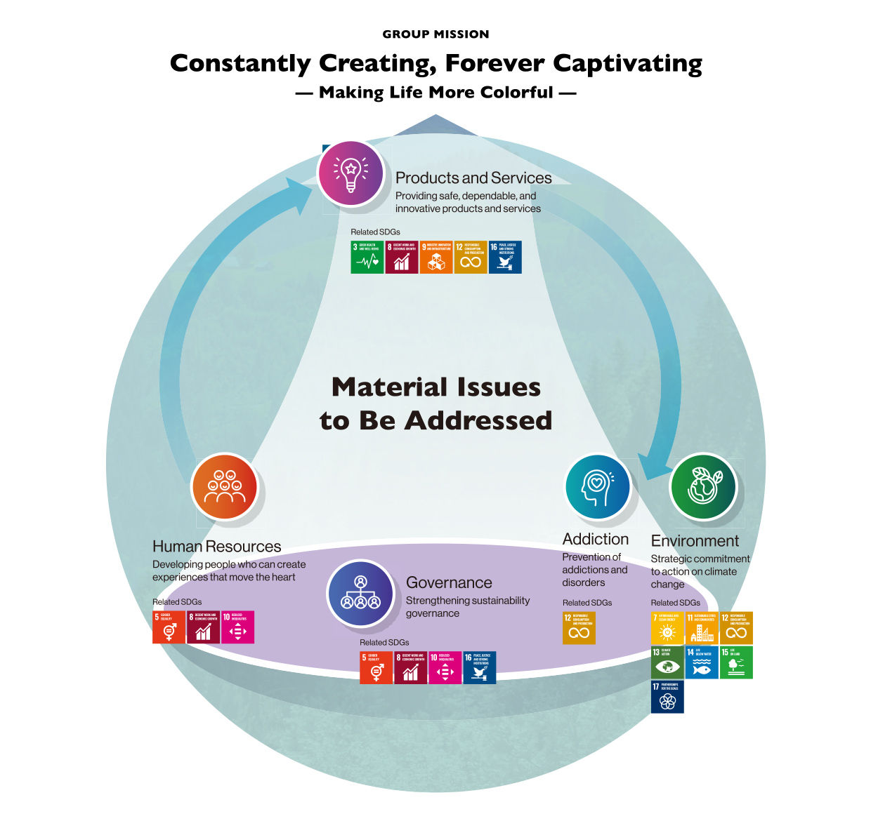 The current five materiality themes were identified by focusing on the value created by our core businesses to meet social needs, achieve a sustainable society, and continuously enhance corporate value, all aligned with our group mission of “Captivate the World.”