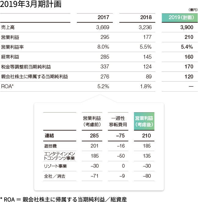 2018年8月以降、順次グループ各社の本社機能を集約していくことに伴い、移転費用約75億円を計上する計画です。この一過性費用を控除する前の実力値ベースの営業利益は、当期比61%増の285億円となります。当期は主に遊技機事業で、計画に対してさらなる上積みを図っていきたいと考えています。