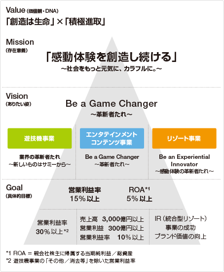 ゲームが子どもに与える影響、遊技機におけるのめり込みの問題といった、「負の側面」は真摯に真正面から捉えていかねばなりません。同時に「負」を超える「正」の「感動」を提供していけば、我々は、社会に存在価値を認められ続けることができると確信しています。こうした想いを込めたのが、サブタイトル「~社会をもっと元気に、カラフルに。~」です。社員は胸を張って、「黒や灰色といった暗い色以上の明るい色を社会に提供する」という志を貫いていってほしいと願っています。