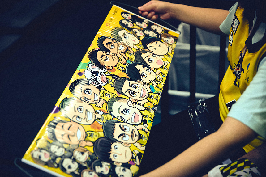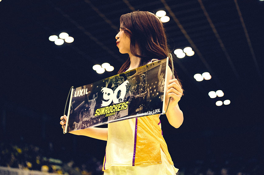ホーム開幕戦は特別なものだと考えており「開幕は是非とも弊社で冠パートナーをさせていただきたい」と以前からお願いしていて、クラブにご協力いただきました。今シーズンはカーボンオフセットをこの試合でやらせていただきましたが、単純なブランディングだけではなく、LIXILの事業を認知していただくための仕掛けも必ず入れさせていただいております。ハンドフラッグに関しては、ファンの皆さんとの一体感を出して、かつ形に残るものがいいと思い、製作しました。普段はチームカラーのイエローをベースにするのですが、今回は90周年ビジュアルを入れ、もう片面にはここ数年恒例となった漫画家の千田純生(ちだ・じゅんせい)さんによる全選手とサンロッカーガールズのイラストを入れさせていただきました。