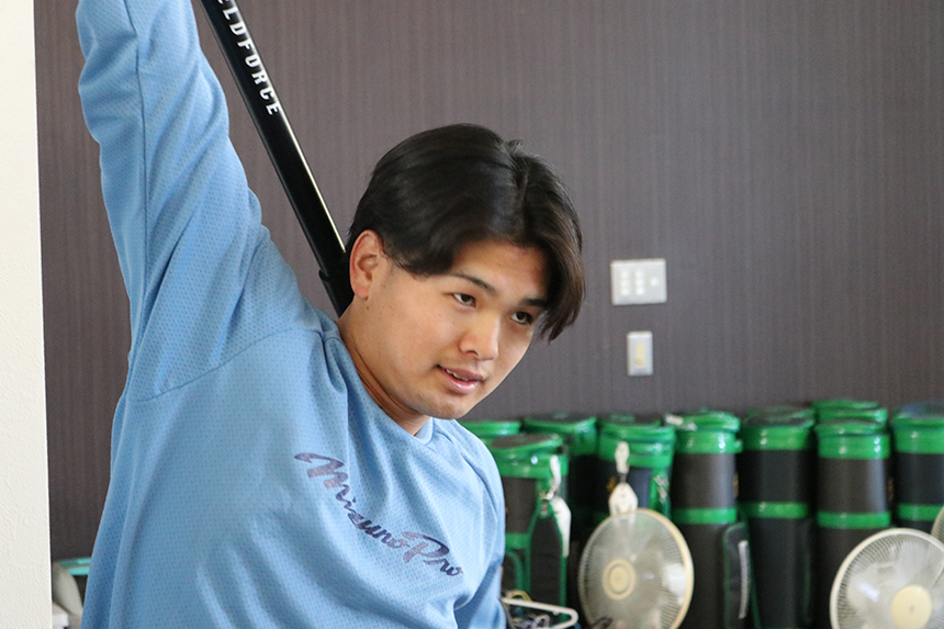 選手たちは朝から毎回ウォーミングアップやキャッチボールを行いますが、その中のメニューの1つが“ペッパー”です。野手が何人かでチームを組んで、軽めの投球、バッティング、そしてボールの捕球がセットになった練習です。こういった基本的な動作をただのルーティンとするのではなく、意識を高く保ち体を動かすことが技術向上に繋がると私は思っていますし、選手たちには“当たり前のことの積み上げ”が大切だと、普段からよく言うようにしていますね。技術向上はもちろんですが、専用球場で自由に野球ができることへの感謝や、挨拶をはじめとした礼節を大切にすることなど、人としての基本を含めた選手たちの“人間的な成長”が、チームの土台になっていくものだと考えています。