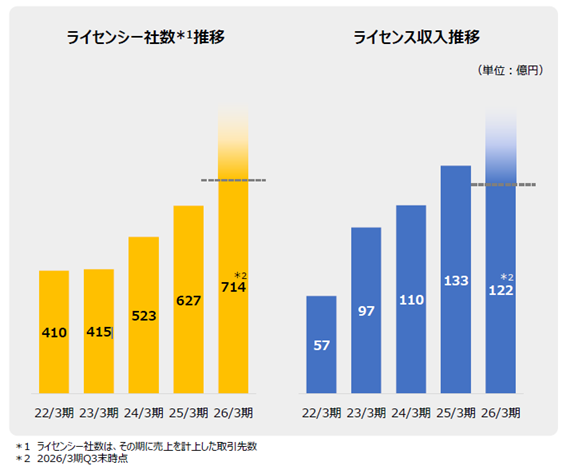 こうした取り組みの結果、セガの2026年3月期のライセンシー社数は、2025年12月末時点で、前年実績を超える実績となっています。ライセンシーの増加に伴い、ライセンス収入も順調に伸びています。