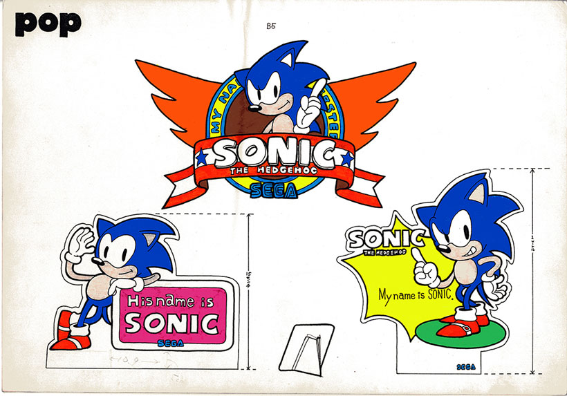 「ソニック」開発時期のポップデザイン資料。当時の開発メンバーは、ゲームが完成するより前から「ソニック」のキャラクターとしての可能性を模索していました。