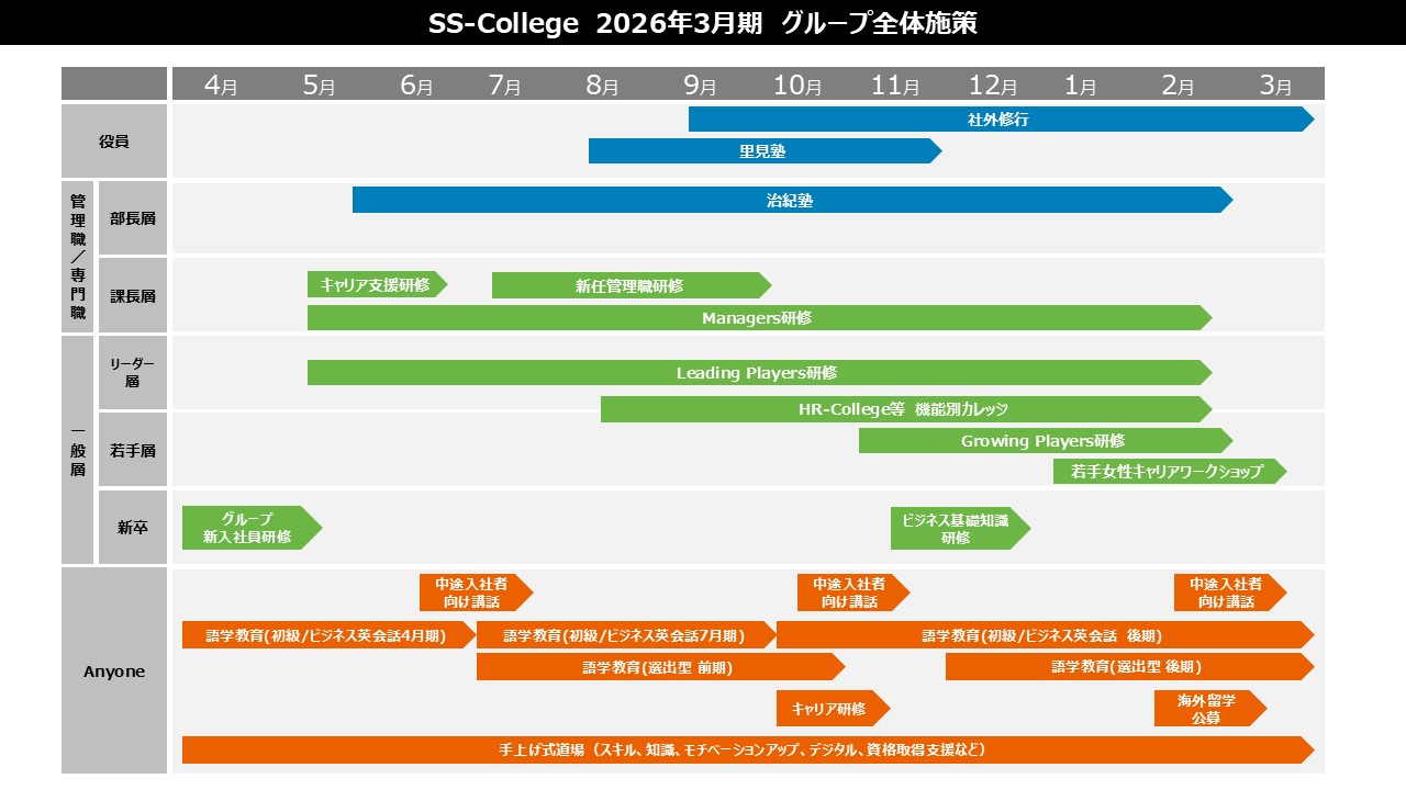 セガサミーらしいリーダーの育成を目的とする「経営塾」「階層別研修」や、希望に応じて様々なスキルを学べる「手挙げ式道場」、グローバルで通用するマルチカルチャー人財を育成するための「グローバル人財育成プログラム」、デジタル人財を育成するための「ITサービスつかいこなし教室」など、プログラムの拡充を進めています。
