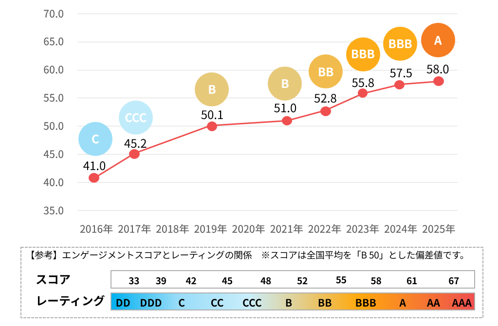 開始当初は40台だったエンゲージメントスコアは、2026年3月期の結果では58.0まで上昇し、2031年3月期目標を5年前倒しで達成いたしました。このスコアは、全体として一定の働きやすい環境が整ってきていることを示しています。今後は、各社の中長期的なビジョンや戦略に基づき、よりユニークで競争力のある組織デザインを進めていくフェーズに移行していきます。